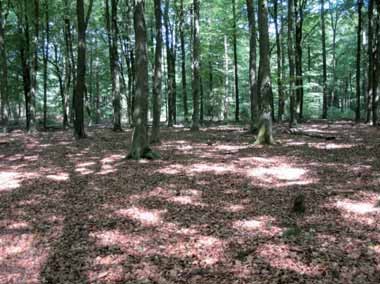 Figure 19-7: Horizontal distribution of sunlight under an almost closed crown roof of beech. The bright spots are caused by direct radiation hitting the forest floor, shifting continuously throughout the day with the movement of the sun. Between the sunspots, only diffuse radiation falls on the ground. Photo: Jan den Ouden.