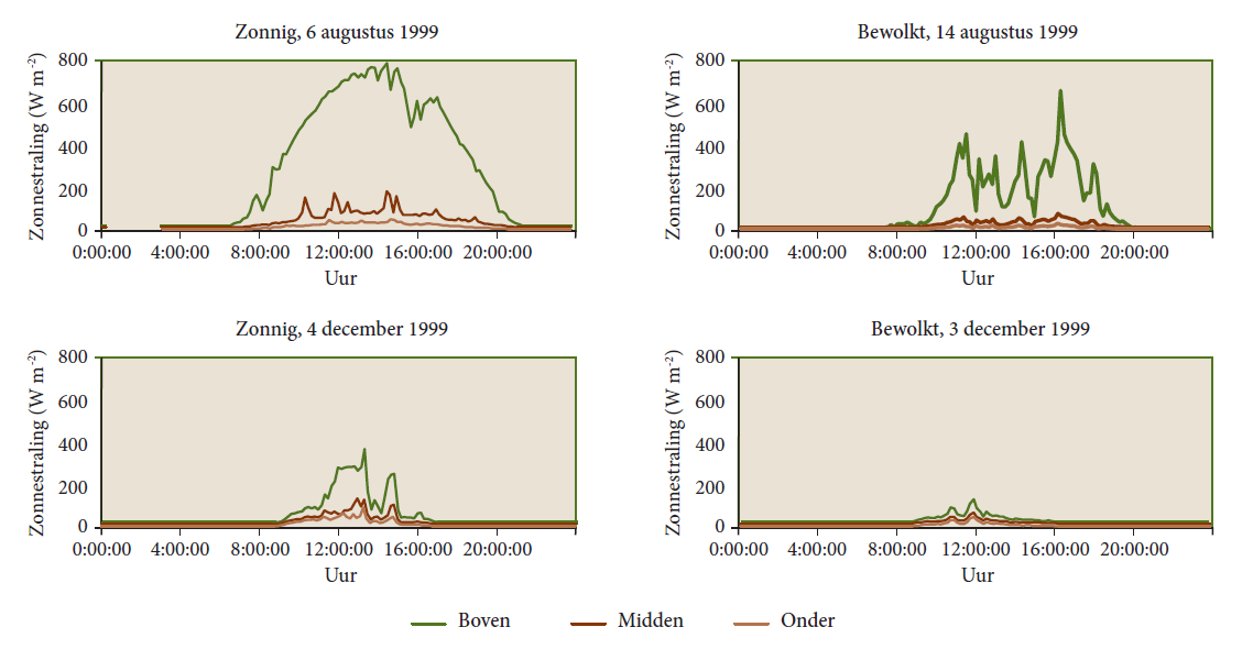 Figure 19-9: Daily course of radiation on two sunny and two cloudy days in August and December respectively, at the Aalmoeseneiebos (Ghent, Belgium). The upper line shows the incoming radiation above the canopy, the middle (dark brown) line gives the radiation directly below the canopy, and the lower line shows the radiation level directly above the forest floor. (Samson 2001).