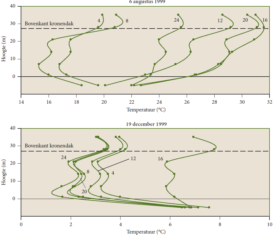 Figure 19-10: Diurnal variation of the vertical profile of air temperature measured at different heights above the forest and in and below the crown canopy, and in the soil in the Alms Grove. The height indicates the distance from the ground level; the soil temperature was measured at a depth of 4 cm, therefore the soil depth is not shown to scale. The measurements refer to a sunny day in August 1999 and a sunny day in December 1999. The numbering of the profile lines represents the time of day, the dots represent measured values (Samson 2001).
