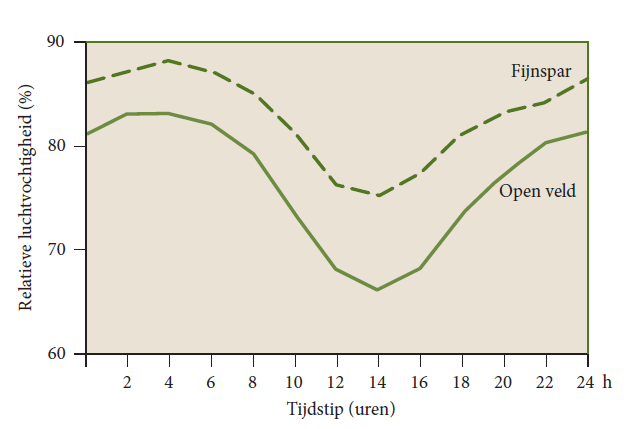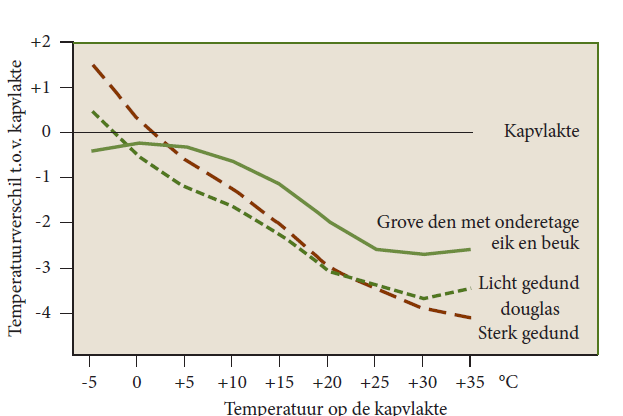 Von Arx et al. (2012) measured temperature differences of up to 5 °C (daily maximum air temperature) in stands with intact crowns compared to open areas on permanent observation plots in Switzerland. The air humidity in the stands with canopy cover was also higher than in stands without canopy cover. The greatly reduced wind speeds inside relatively closed stands can contribute to slower removal of moist air parcels and thus reduce evaporation. The microclimatic buffering effect of the forest against extreme weather was particularly pronounced in shade-tolerant deciduous and coniferous forests, but comparatively low in pine forests (von Arx et al. 2012).