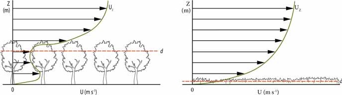 Figure 19-13. Course of wind speed. Left: Course of wind speed with height in a deciduous forest (after Erisman & Draaijers 2003). Right: Progression of wind speed with height above short vegetation. The decrease in wind speed with height is much smaller, down to close to the ground. d: fictitious zero surface displacement