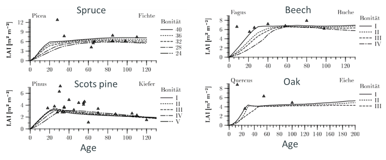 Figure 19-5: Leaf area index (LAI) of different trees species and depending on age (Hörmann et al. 2003)