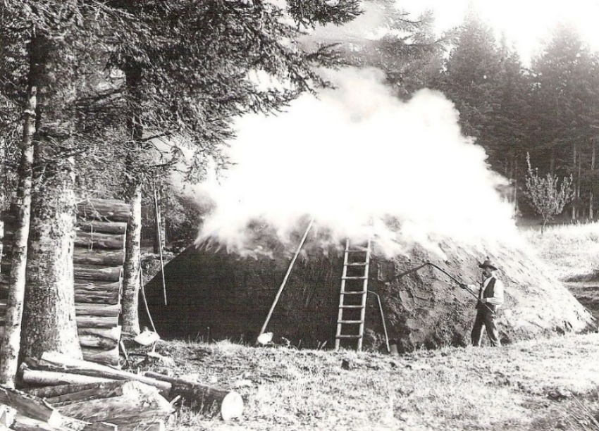Photo Box 46.1.1. A charcoal kiln in full operation in the German Black Forest around 1910. By making holes in the layer of earth over the kiln, the oxygen supply and the temperature in the burning kiln can be accurately controlled. Photo: Karl Blumenthal. |