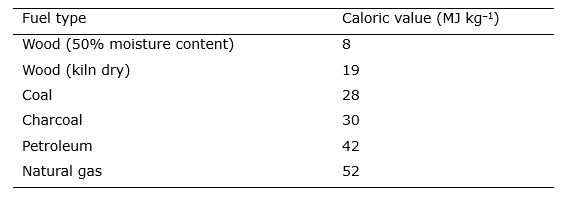 About half of the harvested wood world-wide is used as fuel. Before the emergence of (sub)fossil fuels such as peat, coal, oil and gas, wood was the most important fuel in Europe, and is still important in heavily forested and rural regions. As a fuel type, wood has a medium calorific value (heating value, see Table Box 46.1.1) but its energy efficiency strongly depends on the moisture content. The average calorific value of wood in a dry state is around 19 MJ kg–1 dry matter for European deciduous wood and 19.2 MJ kg–1 for European coniferous wood. Depending on the moisture content (mc%), expressed on a dry matter basis, the calorific value (CV) can be calculated using the formula CV(v%) = [ CV(v%=0) – 0.2164 * mc% ] where the constant 0.2164 reflects the energy required to evaporate water from the wood. Wood can be charred into charcoal. Charcoal weighs much less than wood and has twice the energy content, with an average of 27 MJ kg–1 for charcoal compared to 13 MJ kg–1 for wood with 25-30% moisture content. Charcoal therefore reduces transport costs and is suitable for activities that require high temperatures such as iron forging and glass making. Traditionally, charcoal was made in a charcoal kiln (see Photo Box 46.1.1). A pile of wood was stacked in a special way and covered with sods and a layer of moist, preferably loamy soil (about 20 cm thick) to prevent the entry of oxygen. The wood was ignited through a central shaft in the middle of the kiln and had to burn for days to char all the wood. When hardwood is charred in a kiln, 45-50% of the volume remains, but only 18-20% of the weight. A stacked meter (stère) of oak yields approximately 0.4 m3 charcoal (Anonymus, 1907). According to Rossier and Micuta (1999), 1 kg of charcoal requires 8-12 kg of wood. Modern charcoal production takes place in exterior-heated boilers. Table Box 46.1.1: Energy content of different types of fuels.